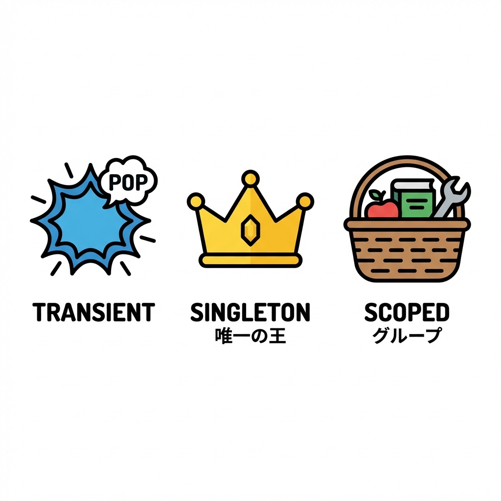 みたいな **ルールを登録(register)**するんだよ〜🧾🪄 この“共有のしかた”が **ライフタイム(生存期間)**で、3種類あるよ😊 (.NET のDIはこの3つが基本だよ〜)(Microsoft Learn)