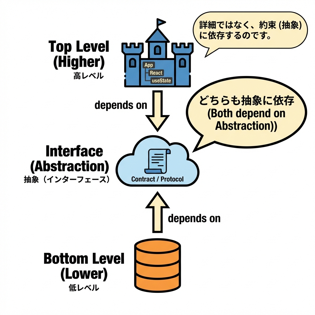 “業務が見る先”を 具象(DB実装)じゃなくて抽象(interface)にするのがコアです✨ (そして、DB実装側がそのinterfaceに合わせる=「詳細が抽象に依存」🔁)