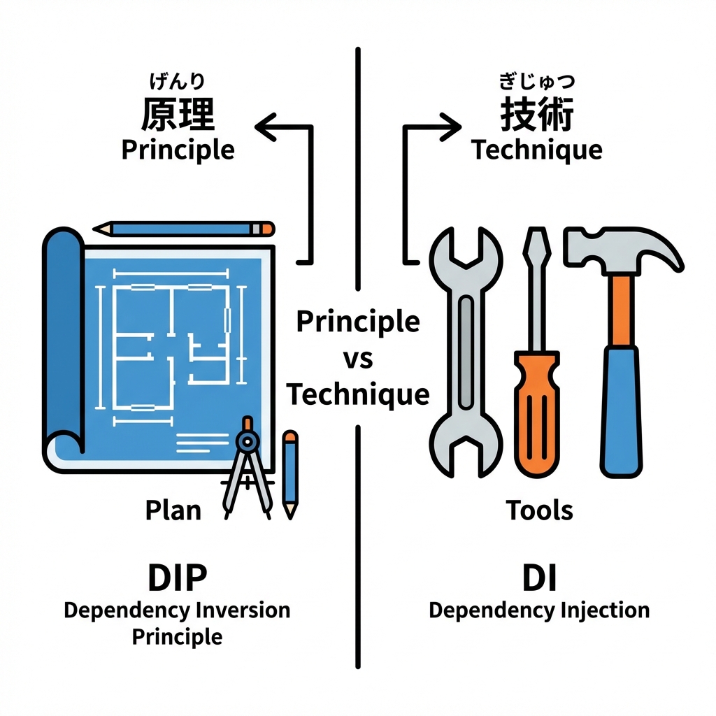 DI(手段): 「じゃあ、その依存をどうやって実装で実現する?」 👉 具体的なやり方(テクニック) 🔧