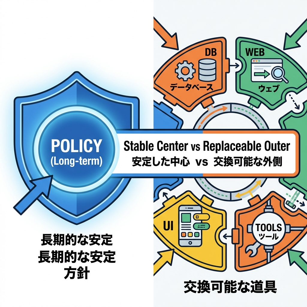 もっと噛み砕くと… “中心の大事なルール(方針)”が、“外側の細かい都合(詳細)”に引っ張られないように固定するってこと😊🧷