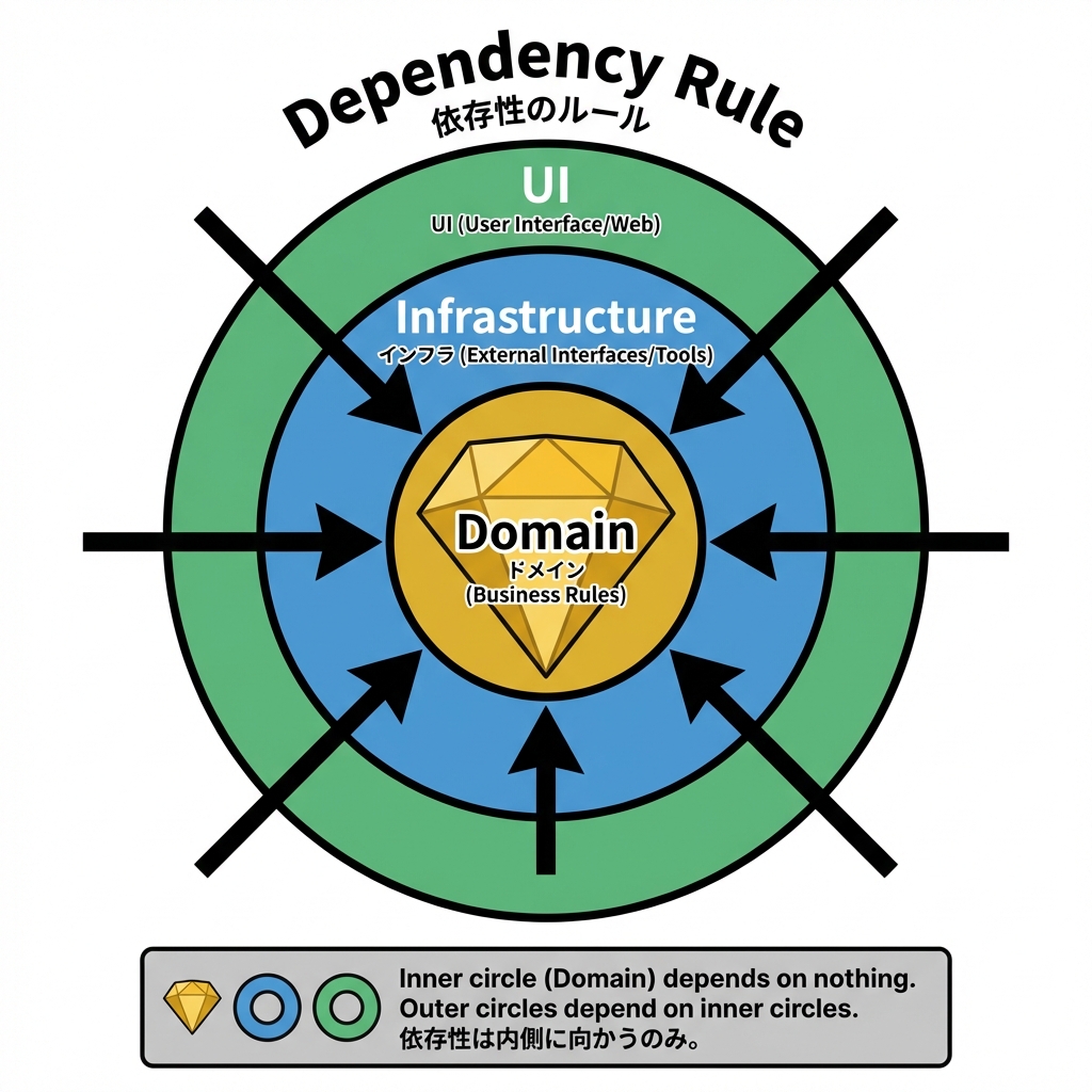 このルールは Clean Architecture の根っこにある考え方で、 「依存は内側へだけ向く」「内側は外側のことを何も知らない」が核です。(Clean Coder Blog)