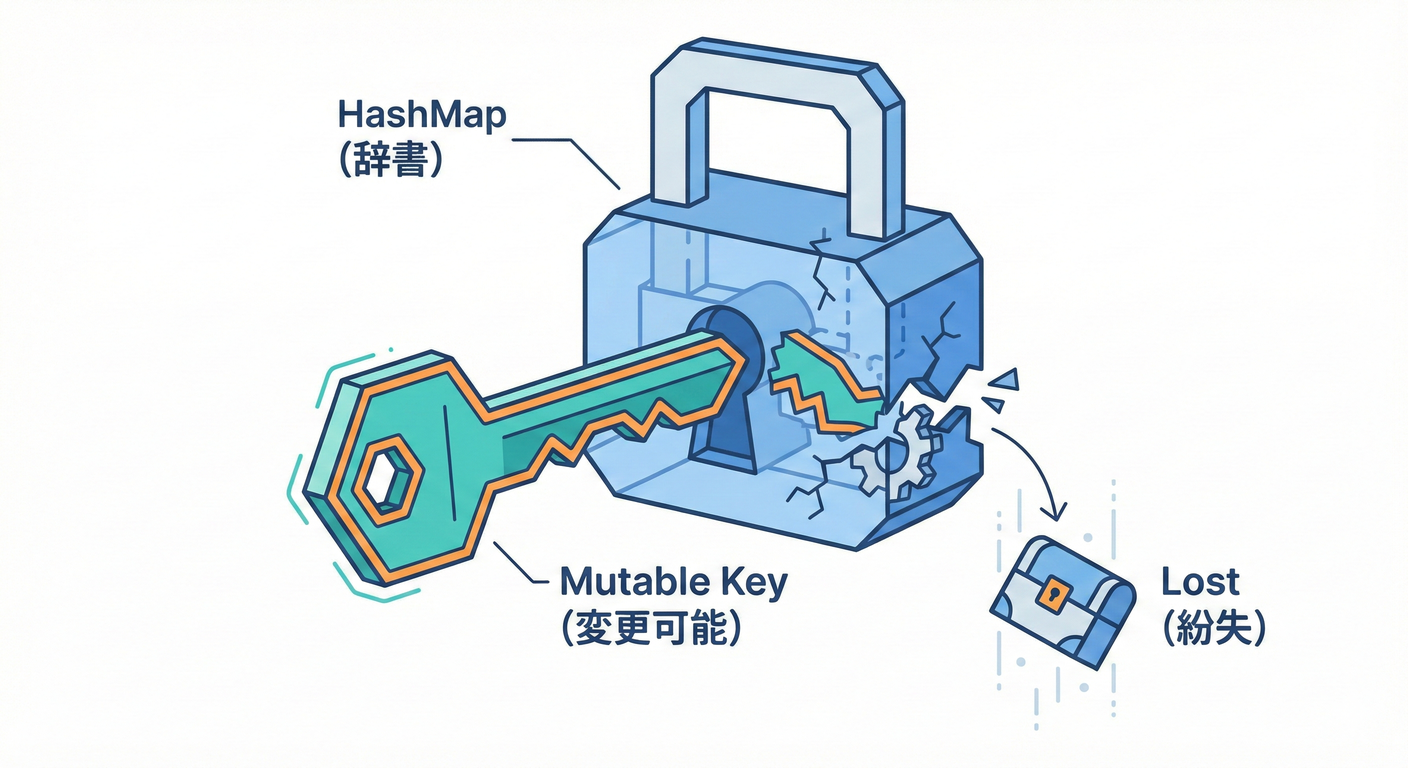 HashSet / Dictionary のキーにした値が あとから変わると… 「置き場(hash)」が変わっちゃって、探せなくなることがあるよ〜!🫠