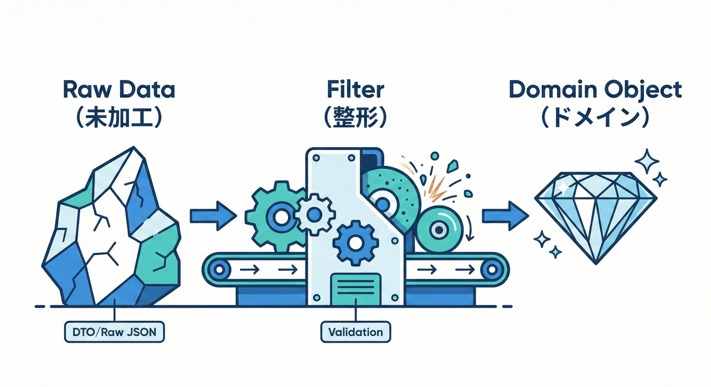 だから入口は、①形チェック → ②VO化 → ③ドメイン生成 の3段階にしよ💪✨